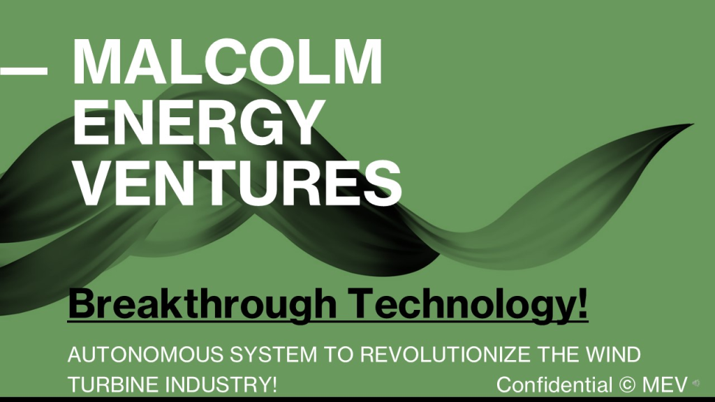 MALCOLM ENERGY VENTURES has developed an autonomous wind turbine system that develops full power at 10 MPH wind speed.
